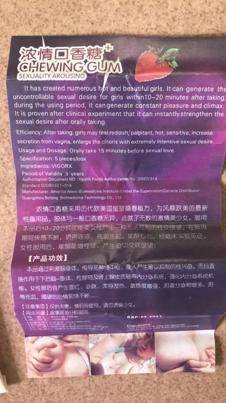 作用机理:春药口香糖为女用催情,味道与普通口香糖没有任何差异,通过咀嚼产生催情效果,女性阴道.内.发.痒,大腿内侧酥麻,心跳加速,下体.分.泌物增多。反应: 女士咀嚼催情口香糖后数分钟后迅速效,粉面微红,呼吸急促,深身燥热,身软如泥。催情分子高达百分之九十五,你值得拥有……