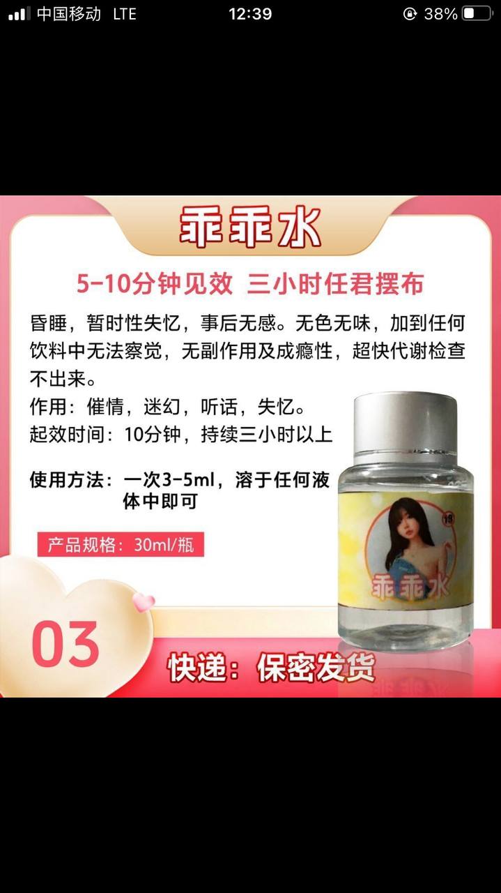 产品介绍:《乖乖水》短时间内使人失去意识,有效增加性欲、助情,激发原始本能,让她不能自控!5分钟见效,效果长达3-4小时,让她乖乖听话,任由你摆布。15-30分钟起效做你所想,答你所问!本产品持续时间长,不受任何外界因素干扰,长期服用,无毒、无副作用、无瘾性。。适用于任何场合。泡妞把妹,你值得拥有!